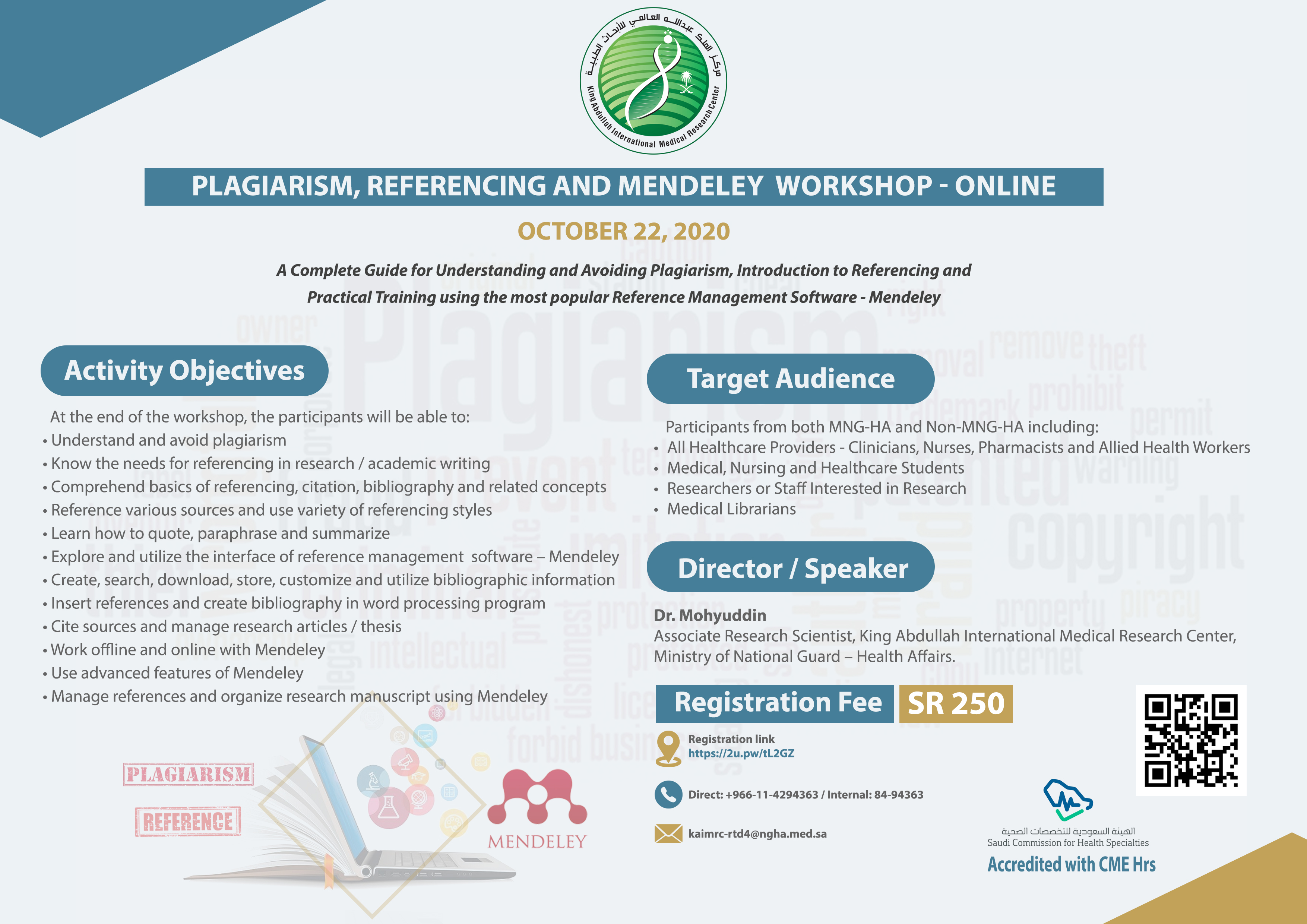King Abdullah International Medical Research Center (KAIMRC) is pleased to announce the “Plagiarism, Referencing and Mendeley Workshop - Online”.