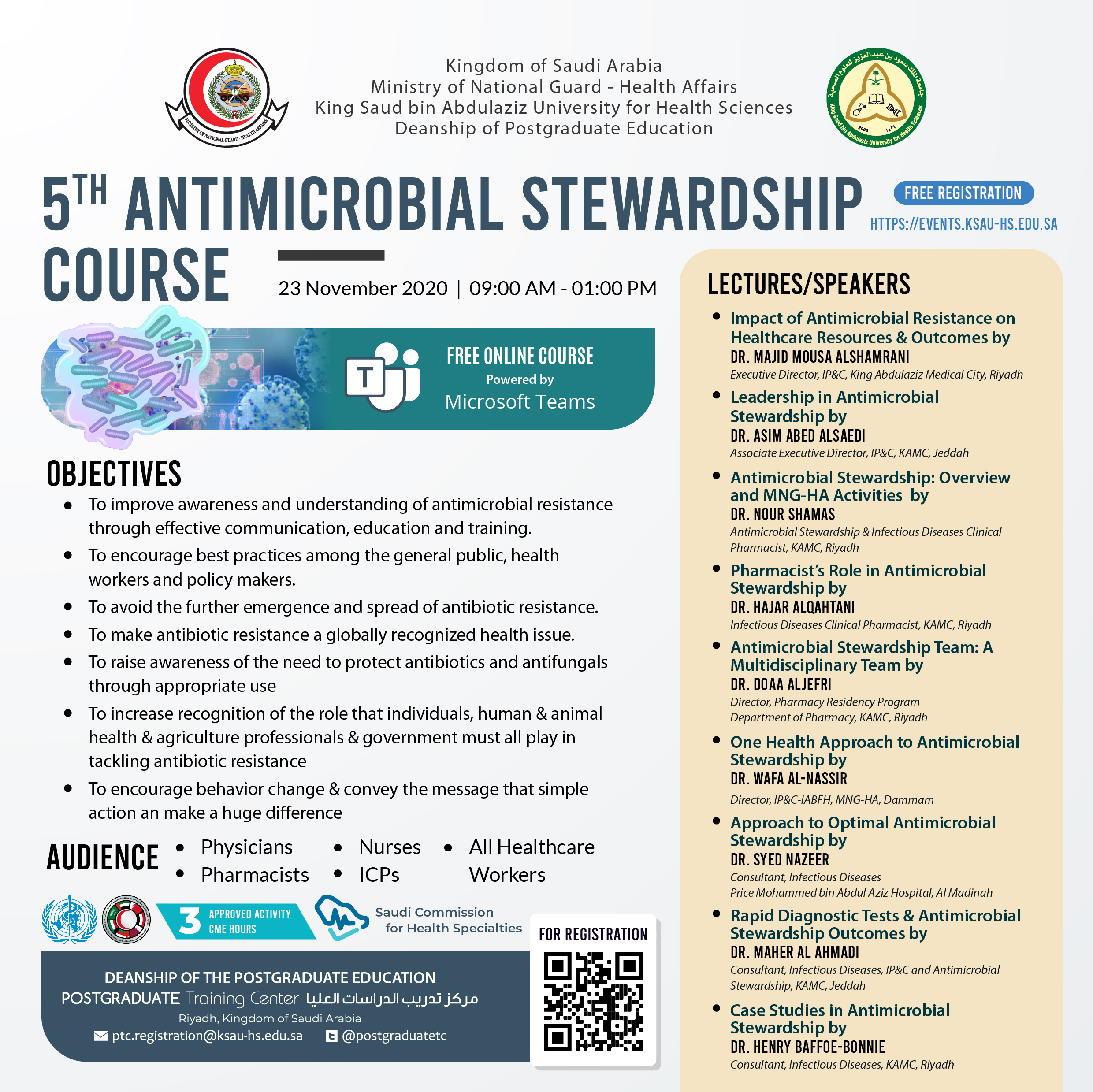 The Ministry of National Guard - Health Affairs (MNG-HA), King Abdulaziz Medical City and Postgraduate Training Center, Deanship of Postgraduate Education, King Saud bin Abdulaziz University for Health Sciences KSAU-HS is pleased to announce the 5th Antimicrobial Stewardship Course Objective: